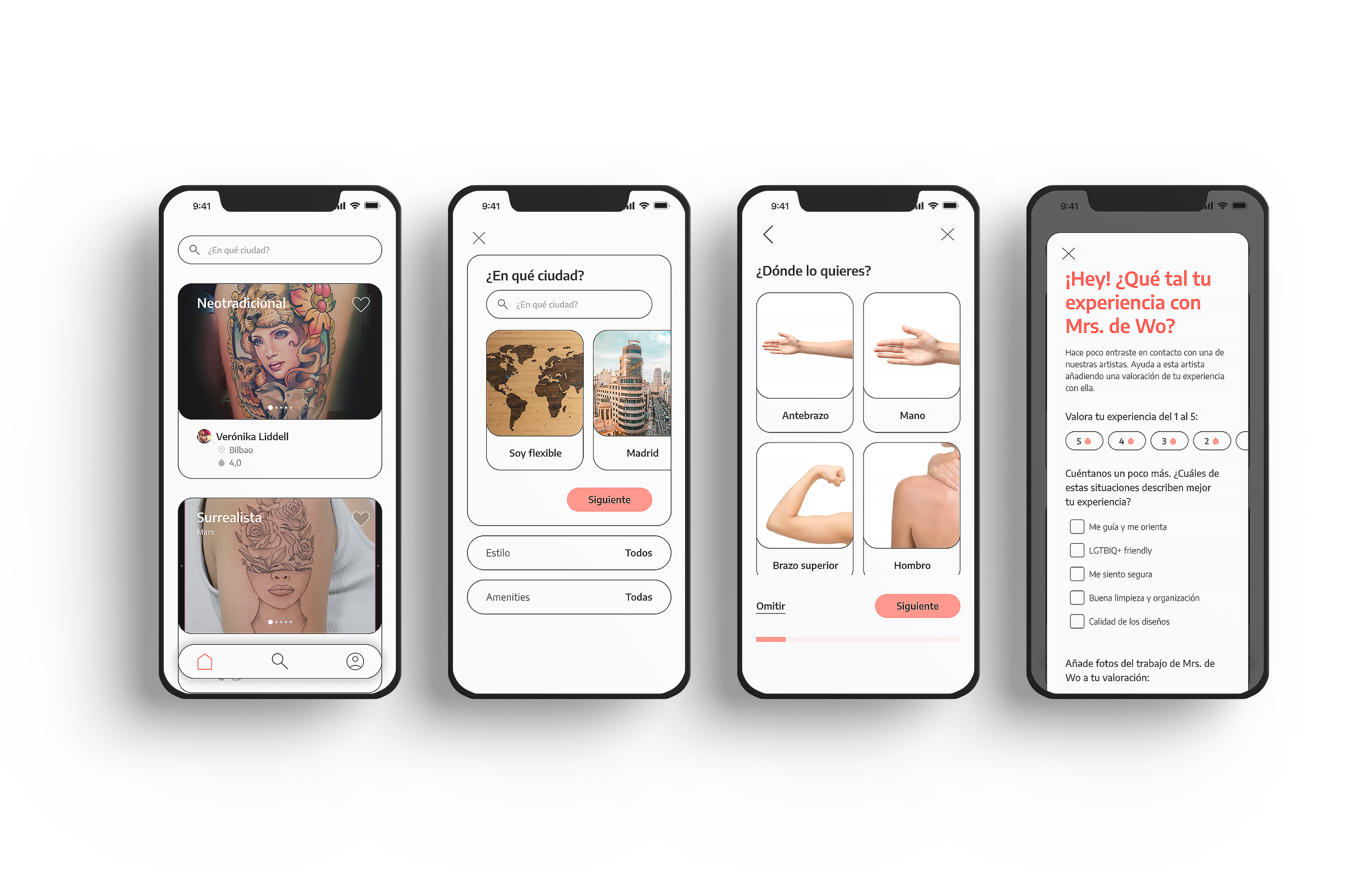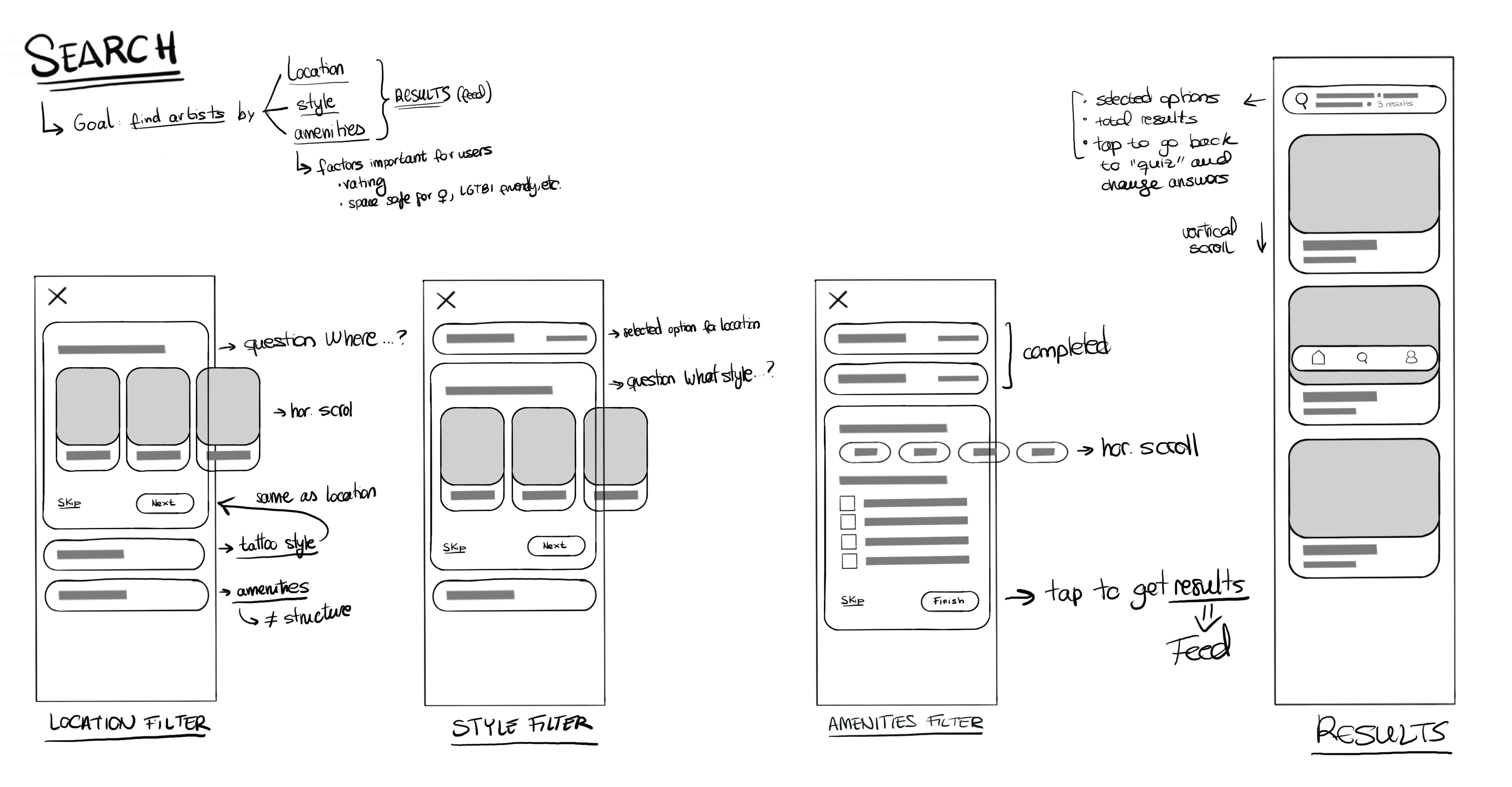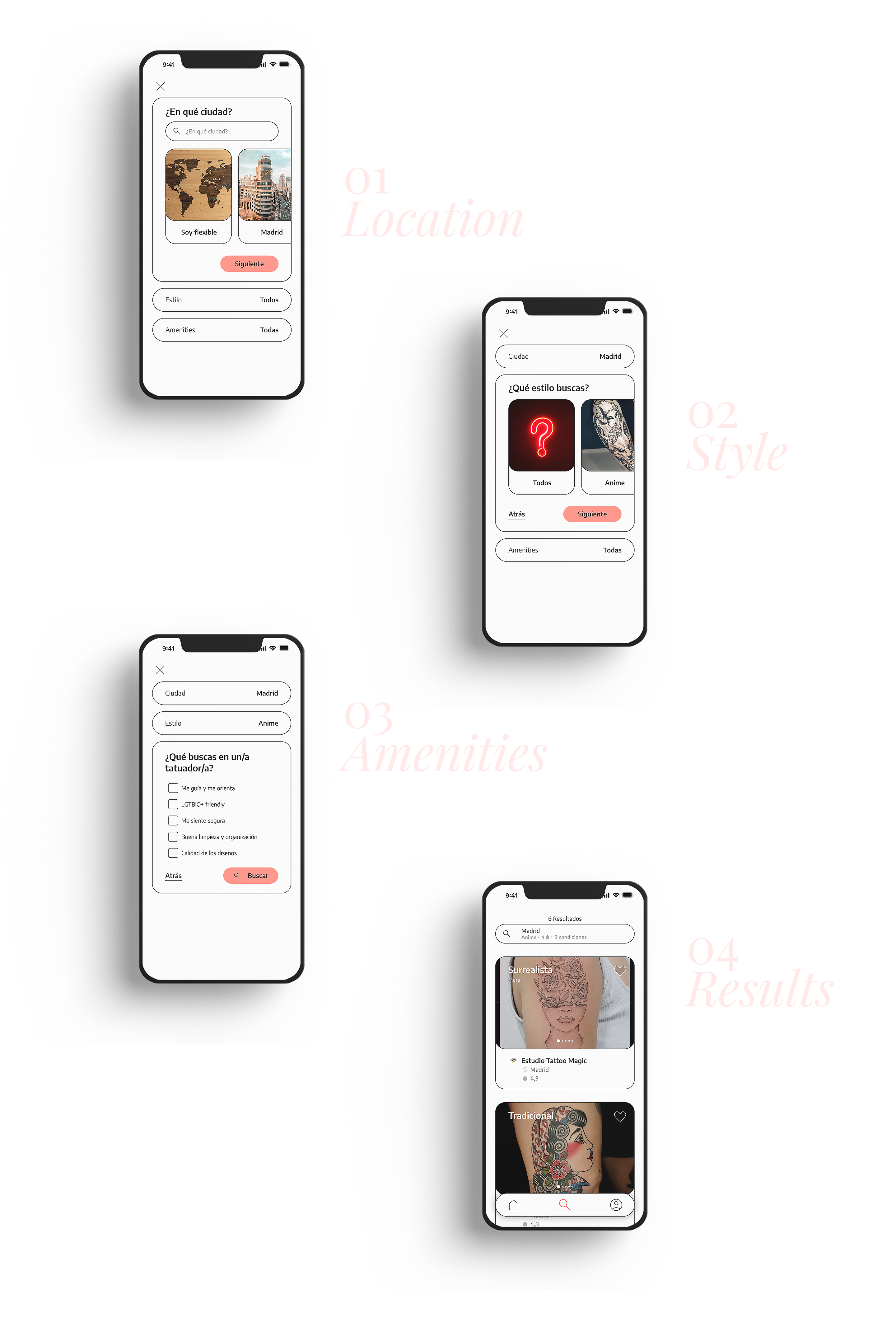 Based on what I learnt from my research, I narrowed the search filters to three: location, tattoo style and amenities. The last one is inspired by the main factors that users take into account when looking for a tattoo artist.