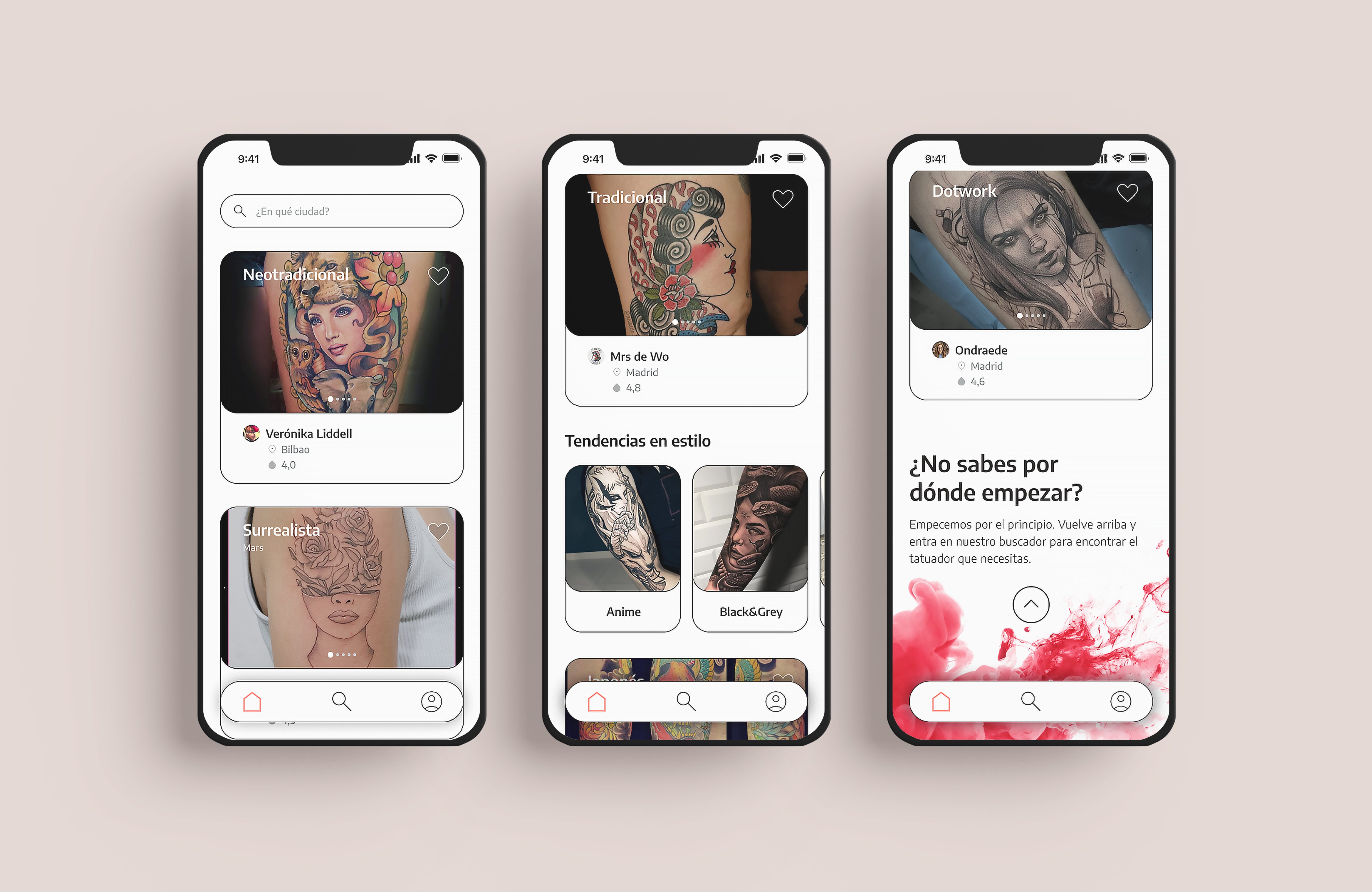 Flash Ink is an academic project focused on finding a digital solution to the problem of searching for tattoo artists. The proposal is a minimalist mobile application that allows you to get inspired, search, book and recommend tattoo artists.