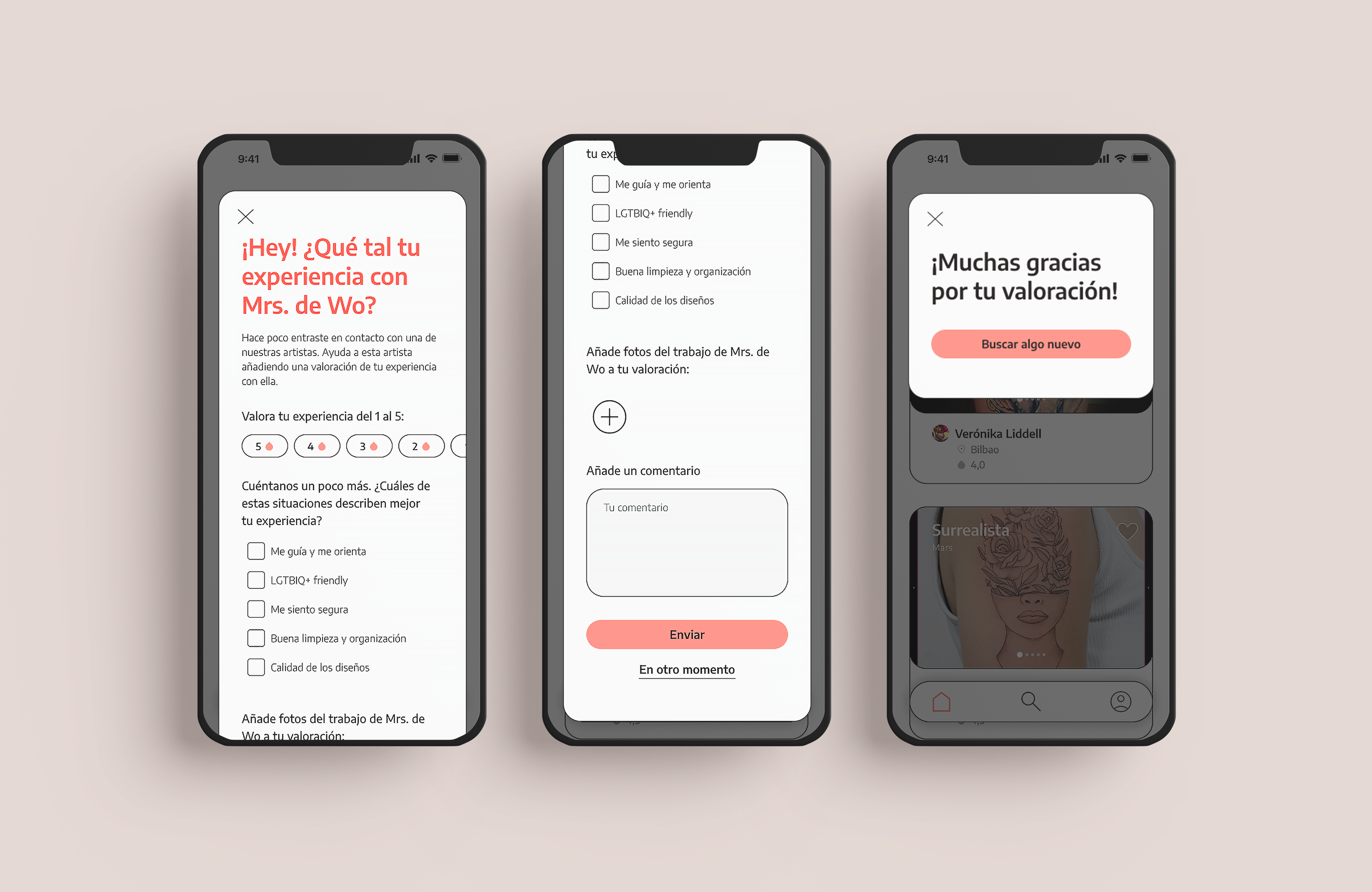 Two weeks after the user has booked an appointment with a tattooist, a modal will pop up in the app, asking the user to rate their experience with the artist. They will have the option to complete this at a later time if they wish.