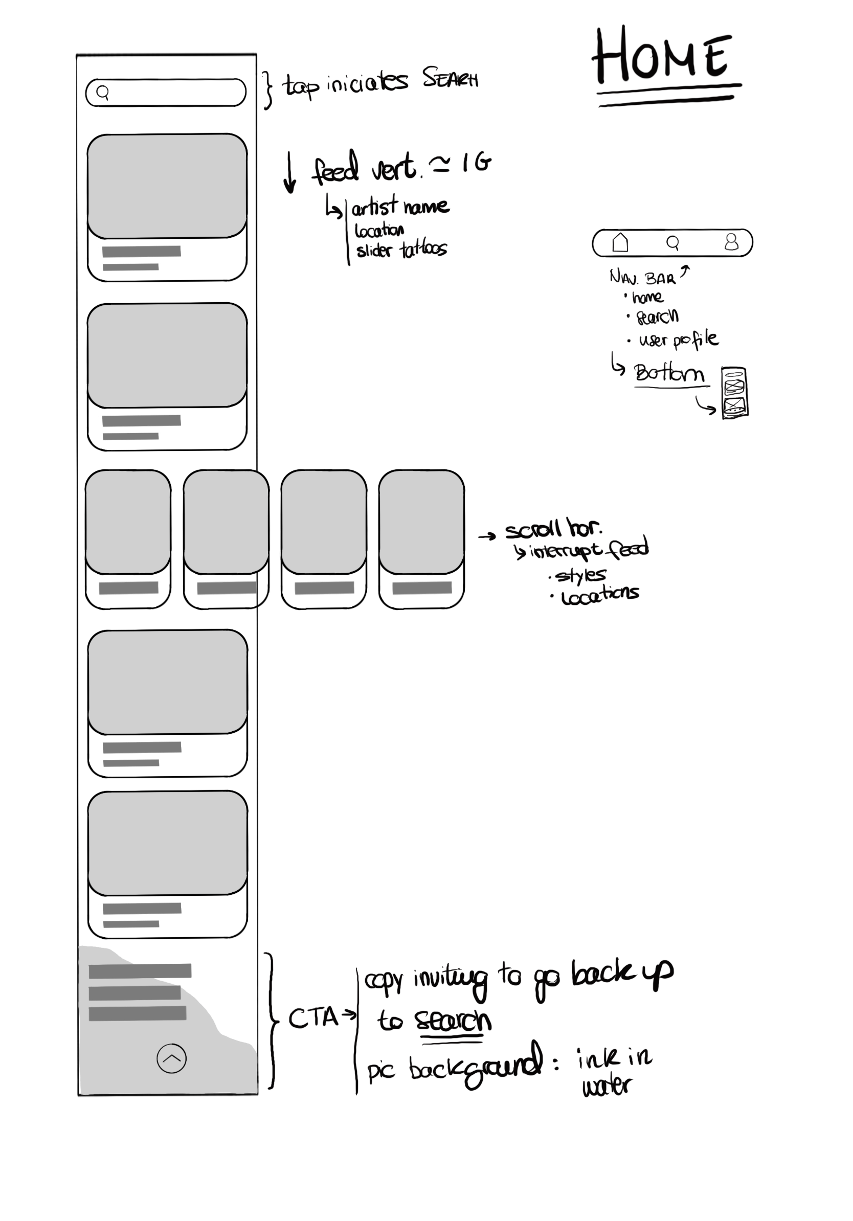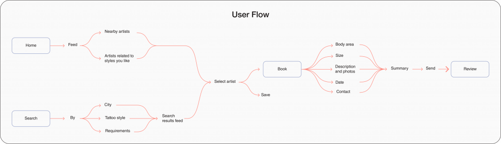 Based on the data found in the research, I opted for a mobile app, given that it is the device most used by users. This app will have four main functions, based on the four main tasks of the process of looking for a tattoo artist. These are: getting inspired and finding an idea (Home), searching for an artist based on the user’s preferences (Search), making an appointment with the tattoo artist (Book), and providing recommendations about the artists (Review).