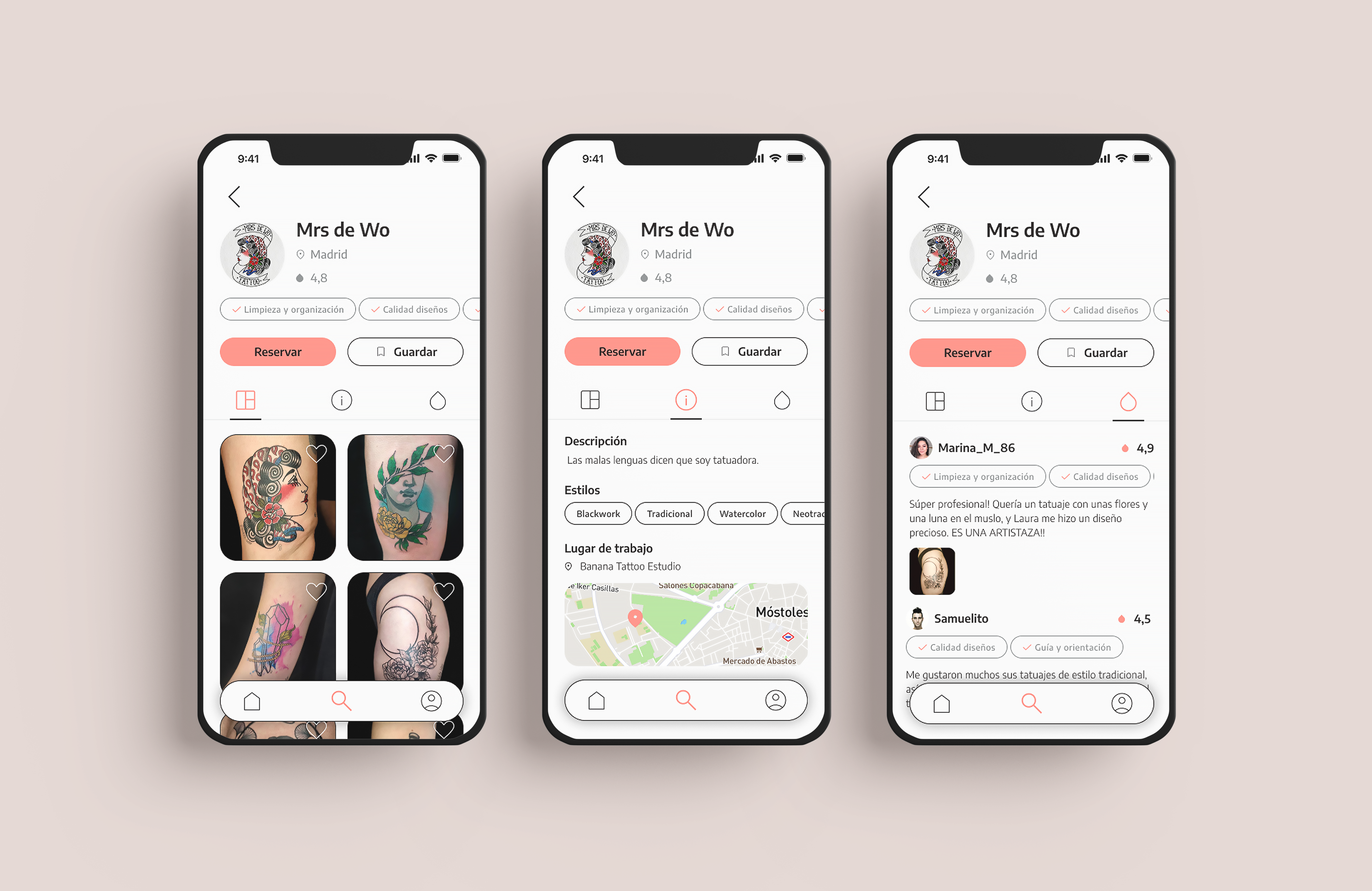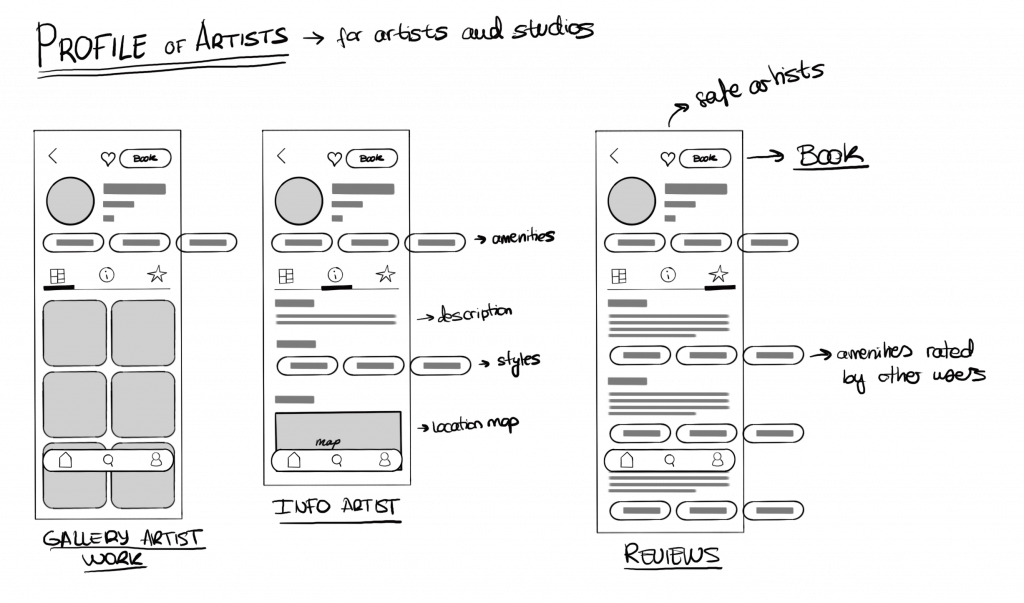 I conducted a desk research on the world of tattoos and an analysis of the competitors’ websites or apps. Shockingly, I learnt that there are not many specialised apps or webs, that not all studios have websites and that the main promotional tool for artists is Instagram.