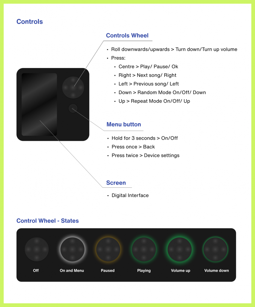 I opted for a wheel with five buttons for the main navigation, which can be turned or pressed. There will also be another button to turn the device on or off, as well as access to the menu. Given the low visibility context, I decided to include LED lights on the wheel, which indicate different actions, such as pause, play or on/off.